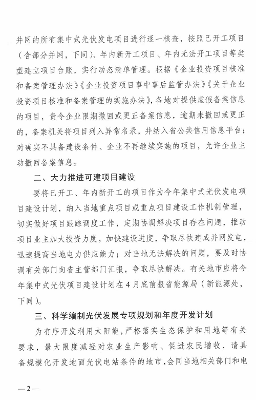 2.大力推進可建項目建設:要將已開工、年內新開工的項目作為今年集中式光伏發(fā)電項目建設計劃,納入當?shù)刂攸c項目或重點項目建設工作機制管理,