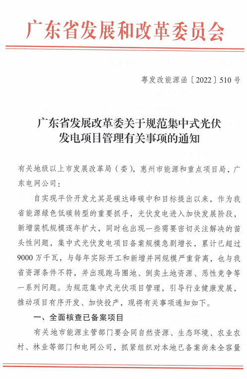 廣東發(fā)改委發(fā)布《關于規(guī)范集中式光伏發(fā)電項目管理有關事項的通知》,全面整頓全省光伏。
