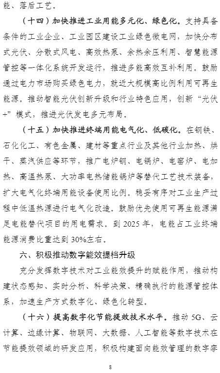 加快推進(jìn)終端用能電氣化、低碳化。在鋼鐵、石化化工、有色金屬、建材等重點(diǎn)行業(yè)及其他行業(yè)加熱、烘干、蒸汽供應(yīng)等環(huán)節(jié),推廣電爐鋼、電鍋爐、電窯爐、電加熱、高溫?zé)岜谩⒋蠊β孰姛醿?chǔ)能鍋爐等替代工藝技術(shù)裝備,擴(kuò)大電氣化終端用能設(shè)備使用比例。穩(wěn)妥有序?qū)I(yè)生產(chǎn)過程中低溫?zé)嵩催M(jìn)行電氣化改造。鼓勵(lì)優(yōu)先使用可再生能源滿足電能替代項(xiàng)目的用電需求。到2025年,電能占工業(yè)終端能源消費(fèi)比重達(dá)到30%左右。