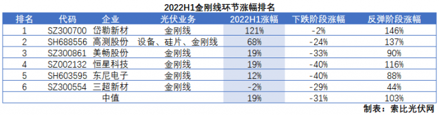 金剛線環(huán)節(jié)受益于硅片環(huán)節(jié)的瘋狂擴(kuò)產(chǎn)以及細(xì)線化趨勢(shì),漲幅達(dá)到19%,其中上行階段漲幅高達(dá)103%。根據(jù)索比光伏網(wǎng)的不完全統(tǒng)計(jì),至2022年末硅片環(huán)節(jié)的設(shè)計(jì)產(chǎn)能將達(dá)到731GW,較2021年末增加263GW,按照50萬公里/GW的線耗和40元/公里的單價(jià)計(jì)算,將新增1.32億公里金剛線需求,對(duì)應(yīng)新增52.60億元的市場(chǎng)規(guī)模。