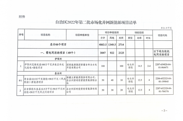 新疆2022年第二批市場化并網(wǎng)新能源項目清單,總計66個項目,規(guī)??傆嫗?0.63GW,其中光伏為27.14GW,風電為13.49GW。