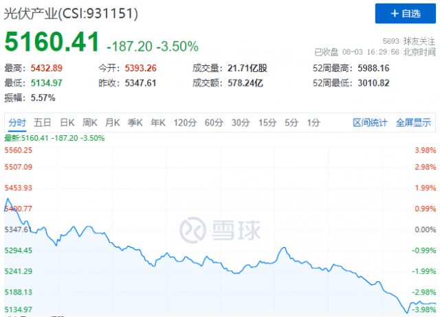 8月3日,受外圍利空因素影響,A股市場(chǎng)避險(xiǎn)情緒高漲。受此影響,光伏板塊尾盤(pán)出現(xiàn)大幅跳水,中證光伏產(chǎn)業(yè)指數(shù)(CSI:931151)大跌3.5%,報(bào)收5160點(diǎn)。