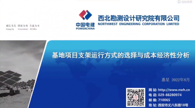 西北勘測設(shè)計研究院有限公司新能源工程院總工程師惠星作基地項目支架運(yùn)行方式的選擇與成本經(jīng)濟(jì)性分析。支架選擇與方案設(shè)計需要綜合考慮光伏電站所處區(qū)域位置、氣候、地貌地形等環(huán)境因素,同時還要考慮發(fā)電小時數(shù)、系統(tǒng)效率、并網(wǎng)情況等,惠星總工程師對各種情況下的光伏支架選擇與成本經(jīng)濟(jì)性分析進(jìn)行了深入分析。