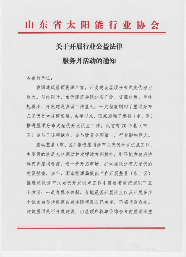 上述“一縣一企、圈而不建、暫停備案”等問題的存在,也嚴重影響了我省太陽能光伏行業(yè)企業(yè)、尤其是分布式光伏開發(fā)企業(yè)的健康穩(wěn)定發(fā)展。為進一步維護行業(yè)企業(yè)權(quán)益、提高行業(yè)企業(yè)法律意識、推動行業(yè)健康穩(wěn)定可持續(xù)發(fā)展,山東省太陽能行業(yè)協(xié)會擬于近期開展會員法律服務(wù)月活動,聘請國家級權(quán)威法律服務(wù)機構(gòu)為行業(yè)企業(yè)答疑解惑,并集中開展行業(yè)公益法律服務(wù)進企業(yè)活動,合法維護會員權(quán)利。