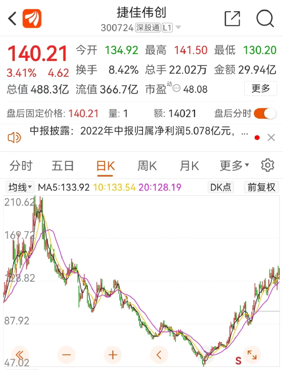 在公布減持計(jì)劃后,捷佳偉創(chuàng)股價(jià)在2021年8月23日達(dá)到歷史最高位210.62元/股。此后,股價(jià)便開(kāi)啟回調(diào)模式。