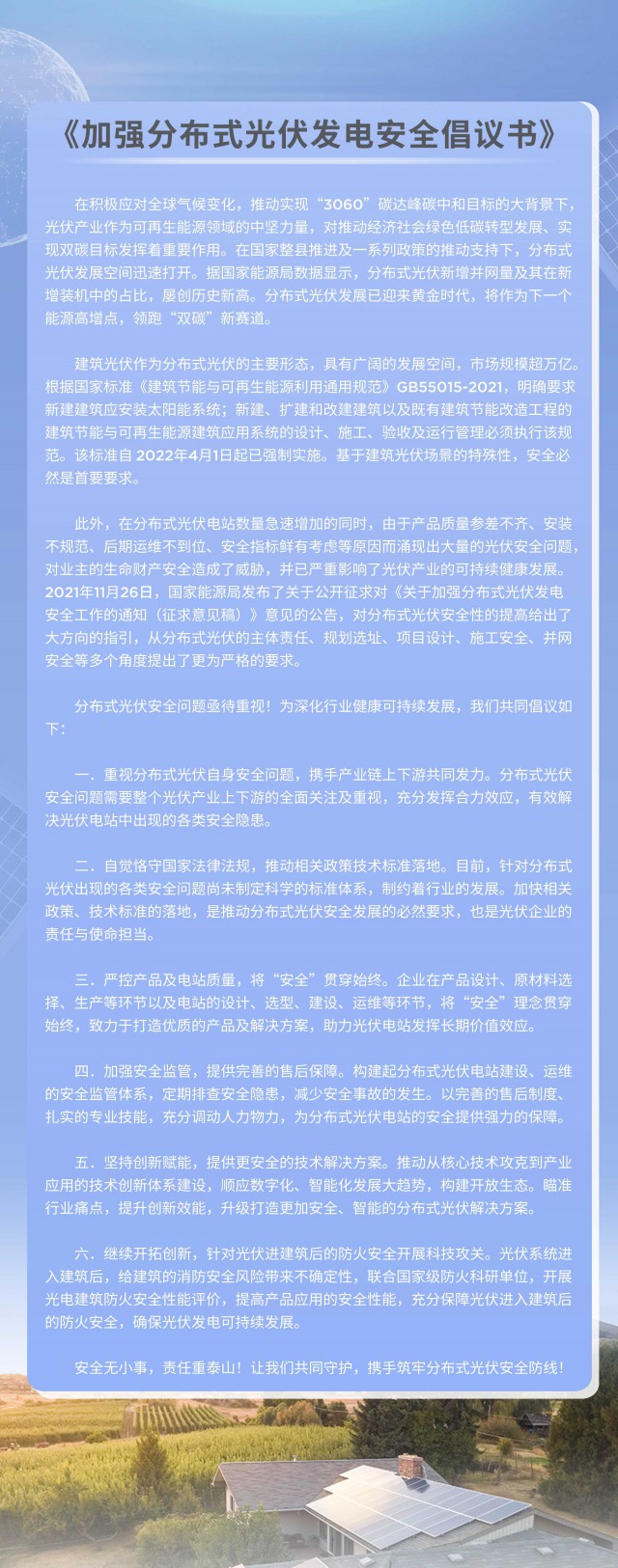 眾所周知,光伏項(xiàng)目安裝在建筑屋頂上,一旦發(fā)生起火等安全事故,后果十分嚴(yán)重。隨著《關(guān)于加強(qiáng)分布式光伏發(fā)電安全工作的通知(征求意見稿)》等政策推進(jìn)落實(shí),對電站安全、特別是電氣安全的重視明顯提升。索比光伏網(wǎng)了解到,《倡議書》發(fā)布后,得到了多位專家的高度評價(jià),預(yù)計(jì)后續(xù)將有更多企業(yè)、機(jī)構(gòu)響應(yīng)這一倡議,提高產(chǎn)品與系統(tǒng)安全性能,避免起火等安全事故,通過行業(yè)上下游協(xié)作、共筑分布式光伏安全防線,確保光伏產(chǎn)業(yè)健康可持續(xù)發(fā)展。