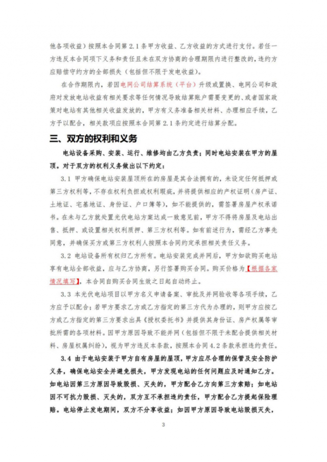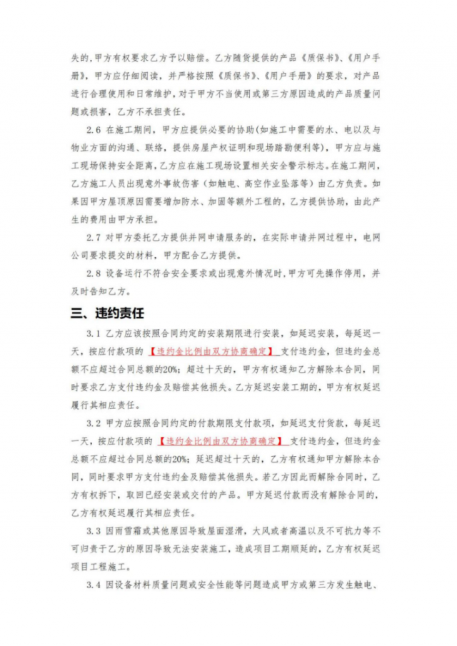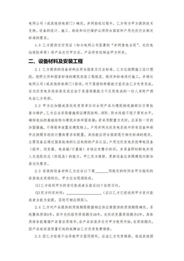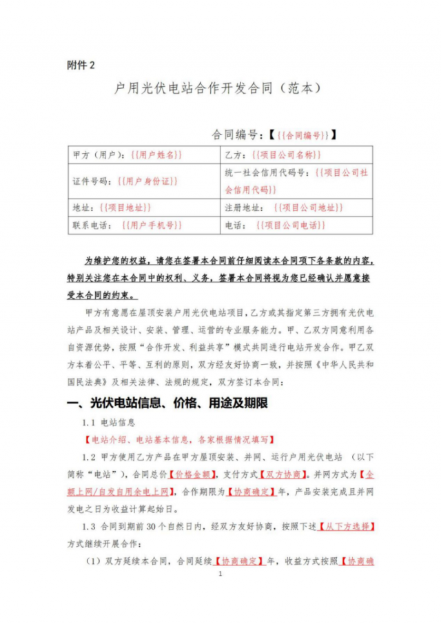 8月30日, 國家能源局轉(zhuǎn)發(fā)了此前中國光伏行業(yè)協(xié)會(huì)在充分征求各方面意見基礎(chǔ)上,編制發(fā)布的《戶用光伏產(chǎn)品銷售安裝合同(范本)》和《戶用光伏電站合作開發(fā)合同(范本)》,供居民用戶和光伏開發(fā)企業(yè)、戶用光伏經(jīng)銷商等各方參考。