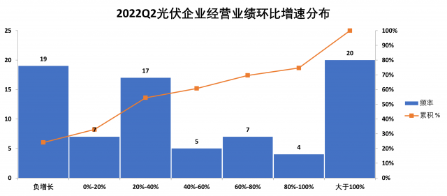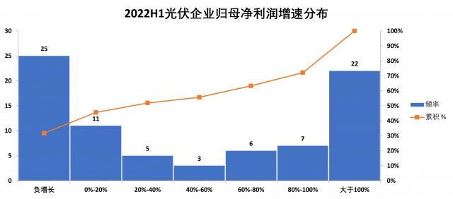 相比于營(yíng)收的普漲態(tài)勢(shì),光伏企業(yè)的經(jīng)營(yíng)業(yè)績(jī)卻出現(xiàn)顯著分化。2022年上半年,79家光伏企業(yè)的歸母凈利潤(rùn)總額達(dá)到650億元,平均增速為32%。其中,利潤(rùn)負(fù)增長(zhǎng)的企業(yè)占比高達(dá)32%,而業(yè)績(jī)翻倍增長(zhǎng)的企業(yè)占比亦達(dá)到28%,呈現(xiàn)顯著的“兩極分化”態(tài)勢(shì)。不過(guò),與2021年不同的是,產(chǎn)業(yè)鏈中游的諸多專(zhuān)業(yè)化廠商紛紛迎來(lái)“困境反轉(zhuǎn)”,而業(yè)績(jī)出現(xiàn)下滑的企業(yè)多為競(jìng)爭(zhēng)力一般的中小市值企業(yè)。