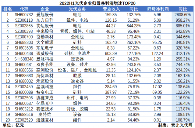 利潤(rùn)增速方面,除了硅料企業(yè)延續(xù)高增長(zhǎng)以外,去年因硅料價(jià)格暴漲而出現(xiàn)虧損的產(chǎn)業(yè)鏈中游專(zhuān)業(yè)化廠商,2022年上半年受益于供應(yīng)鏈管理能力的提升以及產(chǎn)品結(jié)構(gòu)的優(yōu)化,紛紛迎來(lái)困境翻轉(zhuǎn),其中愛(ài)旭股份、東方日升、中來(lái)股份的利潤(rùn)增速分別達(dá)到2609%、958%和643%。此外,岱勒新材、東尼電子兩大金剛線廠商受益于硅片環(huán)節(jié)的擴(kuò)產(chǎn)以及細(xì)線化發(fā)展趨勢(shì),疊加自身的產(chǎn)能擴(kuò)張和成本下降,利潤(rùn)增速均超300%。