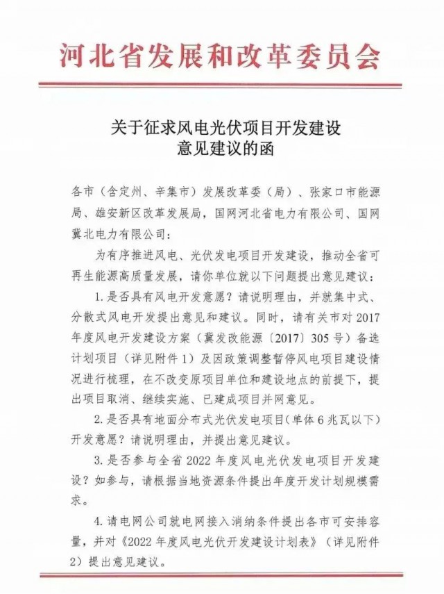 在征求意見函中,河北省發(fā)改委要求各地主管部門就風(fēng)電、地面分布式光伏開發(fā)意愿進(jìn)行說明,并請電網(wǎng)公司就電網(wǎng)接入消納條件提出各市可安排容量,并對《2022年度風(fēng)電光伏開發(fā)建設(shè)計劃表》提出意見建議。