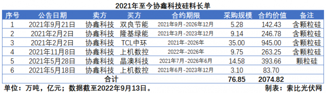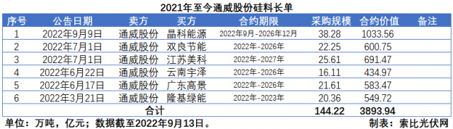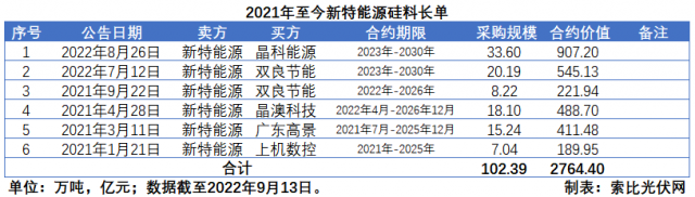 通過簽訂硅料長單、鎖定優(yōu)質(zhì)客戶,硅料三巨頭能夠有效規(guī)避市場瘋狂擴產(chǎn)、競爭加劇對自身出貨量的影響,同時也能夠有效消化自身的新增產(chǎn)能,在高速增長的市場中保持甚至提升自身的市場份額。
