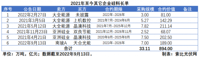 除了硅料三巨頭以外,大全能源、亞洲硅業(yè)兩大老牌硅料廠商分別取得了規(guī)模達(dá)到16.09萬噸和10.02萬噸、合約價值434.43億元和270.57億元的長單。而就在昨天,南玻集團宣布與天合光能達(dá)成價值212.10億元的4年7萬噸長約。