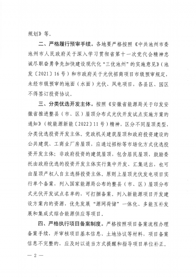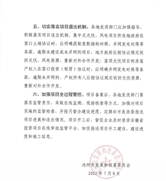 通知強(qiáng)調(diào):各地要嚴(yán)格按照《中共池州市委池州市人民政府關(guān)于深入學(xué)習(xí)貫徹省第十一次黨代會(huì)精神忠誠(chéng)盡職奮勇爭(zhēng)先加快建設(shè)現(xiàn)代化“三優(yōu)池州”的實(shí)施意見》(池發(fā)(2021] 16號(hào))和市政府關(guān)于光伏招商項(xiàng)目市級(jí)預(yù)審規(guī)定,未經(jīng)市級(jí)預(yù)審的地面(水面)光伏、風(fēng)電項(xiàng)目,各縣區(qū)、園區(qū)不得簽訂投資協(xié)議。