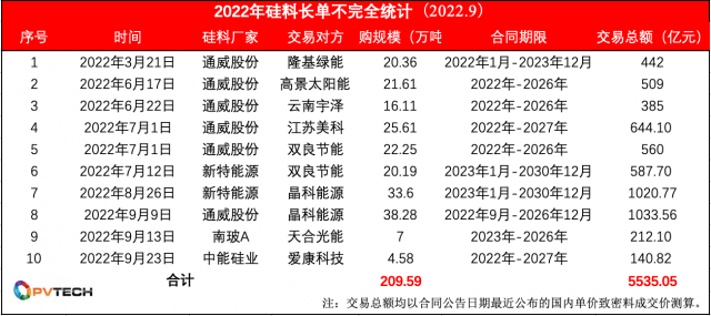 2022年以來硅料長單不完全統(tǒng)計(jì),PV Tech