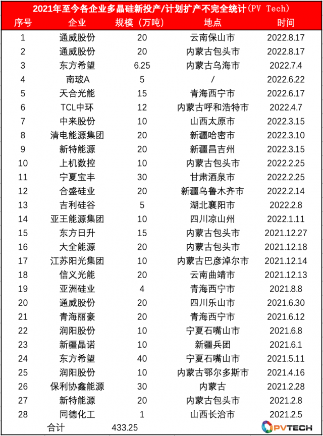 2021年至今各企業(yè)多晶硅新投產(chǎn)/計(jì)劃擴(kuò)產(chǎn)不完全匯總(PV Tech)