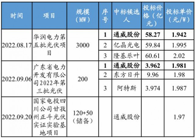 今年8月17日,通威成為華潤(rùn)電力3GW集采大單第一中標(biāo)候選人,間隔不到一個(gè)月,9月6日,通威又以第一中標(biāo)候選人中標(biāo)廣東省電力開發(fā)有限公司將近4億元的組件大單。
