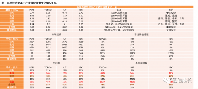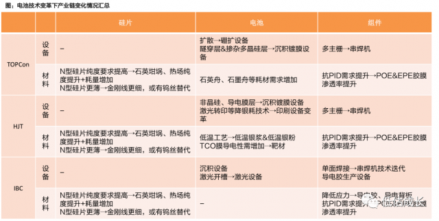 核心結(jié)論為:短期TOPCon與P型IBC具有優(yōu)勢,中期TOPCon、HJT、IBC或?qū)⒐泊?,長期預(yù)計將往TBC&HBC轉(zhuǎn)型;新技術(shù)變化下,較看好設(shè)備、電池組件、銀漿&銀粉。