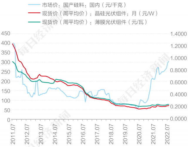 2011年7月開始下行以來,至2022年7月國產(chǎn)硅料價格走出一條V形線,11年過去,還未達(dá)到當(dāng)時的價格水平 圖片來源:每經(jīng)記者 劉國梅 制圖
