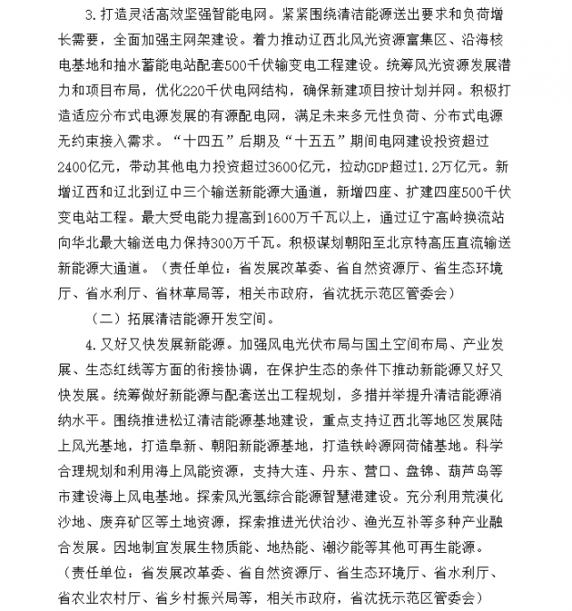 加強(qiáng)風(fēng)電光伏布局與國土空間布局、產(chǎn)業(yè)發(fā)展、生態(tài)紅線等方面的銜接協(xié)調(diào),在保護(hù)生態(tài)的條件下推動新能源又好又快發(fā)展。統(tǒng)籌做好新能源與配套送出工程規(guī)劃,多措并舉提升清潔能源消納水平。圍繞推進(jìn)松遼清潔能源基地建設(shè),重點(diǎn)支持遼西北等地區(qū)發(fā)展陸上風(fēng)光基地,打造阜新、朝陽新能源基地,打造鐵嶺源網(wǎng)荷儲基地??茖W(xué)合理規(guī)劃和利用海上風(fēng)能資源,支持大連、丹東、營口、盤錦、葫蘆島等市建設(shè)海上風(fēng)電基地。探索風(fēng)光氫綜合能源智慧港建設(shè)。充分利用荒漠化沙地、廢棄礦區(qū)等土地資源,探索推進(jìn)光伏治沙、漁光互補(bǔ)等多種產(chǎn)業(yè)融合發(fā)展。因地制宜發(fā)展生物質(zhì)能、地?zé)崮?、潮汐能等其他可再生能源?/p>