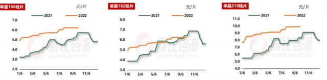 根據(jù)索比咨詢對(duì)多家電池片制造商的調(diào)研:就9月硅片價(jià)格行情來(lái)看,單晶166mm均價(jià)6.24元/片,較9月環(huán)比持平;單晶182mm均價(jià)漲至7.51元/片,較8月環(huán)比上漲0.27%;單晶210mm均價(jià)漲至9.91元/W,較8月環(huán)比上升0.20%。