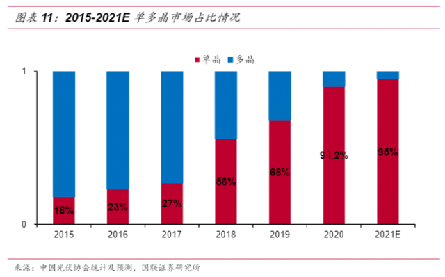 國聯(lián)證券研究所的數(shù)據(jù)顯示:2018年,單晶的市場份額占比達到了56%,到2021年則高達95%。五年間,單晶硅市場占比翻了5倍。