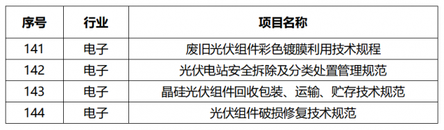在公布的《2022年度工業(yè)節(jié)能與綠色標準研究項目清單》中,共包括鋼鐵、有色金屬、石化化工、建材、機械、汽車、輕工、紡織、電子、包裝、通信、船舶及綜合13個大類157項規(guī)范項目,其中在電子行業(yè),光伏電站的拆除、廢棄光伏組件的運輸、包裝、貯存及修復等技術(shù)規(guī)范被納入其中,分別為《廢舊光伏組件彩色鍍膜利用技術(shù)規(guī)程》、《光伏電站安全拆除及分類處置管理規(guī)范》、《晶硅光伏組件回收包裝、運輸、貯存技術(shù)規(guī)范》及《光伏組件破損修復技術(shù)規(guī)范》4項規(guī)范。