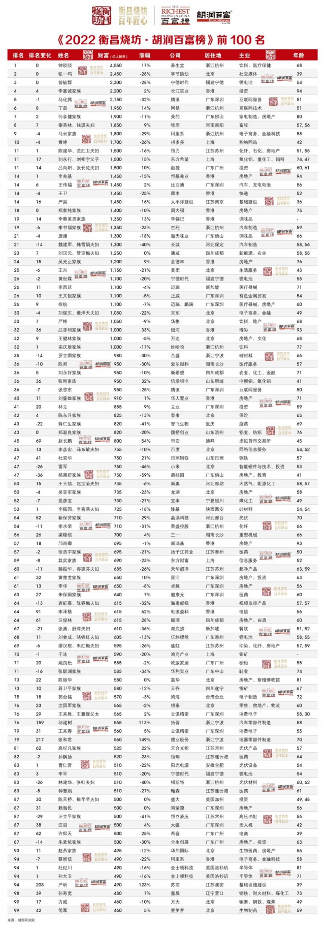 榜單顯示上榜企業(yè)家總財富比去年下降18%,至24.5萬億元。只有411位企業(yè)家財富比去年增長,其中133位新人。1,187位企業(yè)家財富比去年縮水或保持不變,其中293位今年落榜。工業(yè)產(chǎn)品、房地產(chǎn)、大健康、消費品和食品飲料是上榜企業(yè)家的前五大財富來源。
