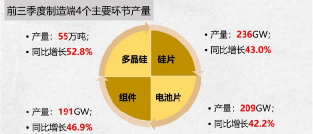 從制造環(huán)節(jié)來(lái)看,旺盛的市場(chǎng)需求驅(qū)動(dòng)制造端強(qiáng)勁增長(zhǎng)。前三季度,多晶硅、硅片、組件、電池片4個(gè)環(huán)節(jié)的增長(zhǎng)速度均超過(guò)40%。其中,多晶硅產(chǎn)量55萬(wàn)噸,同比增長(zhǎng)52.8%;硅片產(chǎn)量236GW,同比增長(zhǎng)43%;組件產(chǎn)量191GW,同比增長(zhǎng)46.9%;電池片產(chǎn)量209GW,同比增長(zhǎng)42.2%。