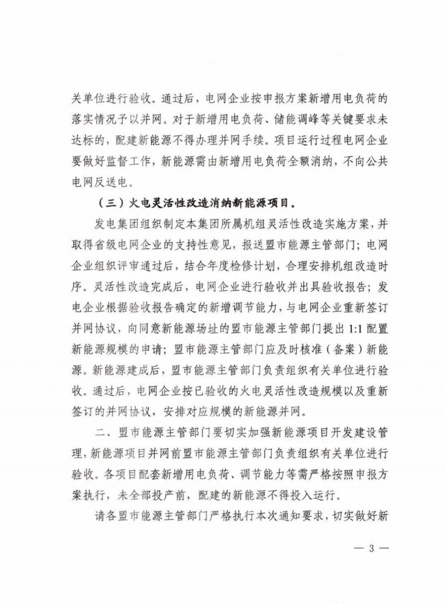 發(fā)電集團(tuán)組織制定本集團(tuán)所屬機(jī)組靈活性改造實(shí)施方案,并取得省級電網(wǎng)企業(yè)的支持性意見,報(bào)送盟市能源主管部門:電網(wǎng)企業(yè)組織評審?fù)ㄟ^后,結(jié)合年度檢修計(jì)劃,合理安排機(jī)組改造時(shí)序。靈活性改造完成后,電網(wǎng)企業(yè)進(jìn)行驗(yàn)收并出具驗(yàn)收報(bào)告:發(fā)電企業(yè)根據(jù)驗(yàn)收報(bào)告確定的新增調(diào)節(jié)能力,與電網(wǎng)企業(yè)重新簽訂并網(wǎng)協(xié)議,向同意新能源場址的盟市能源主管部門提出 1:1 配置新能源規(guī)模的申請;盟市能源主管部門應(yīng)及時(shí)核準(zhǔn)(備案)新能源。新能源建成后,盟市能源主管部門負(fù)責(zé)組織有關(guān)單位進(jìn)行驗(yàn)收。通過后,電網(wǎng)企業(yè)按已驗(yàn)收的火電靈活性改造規(guī)模以及重新簽訂的并網(wǎng)協(xié)議,安排對應(yīng)規(guī)模的新能源并網(wǎng)。