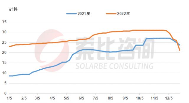 據(jù)索比咨詢統(tǒng)計(jì),2022年的前11個(gè)月,多晶硅一直延續(xù)之前的上漲態(tài)勢(shì)。以單晶致密料為例,從年初的22.91萬(wàn)元/噸開(kāi)始不斷上漲,最高達(dá)到30.88萬(wàn)元/噸,且保持較長(zhǎng)時(shí)間(9月-11月),直到11月底出現(xiàn)試探性下跌,并在12月出現(xiàn)快速下降,目前致密料已降至20.98萬(wàn)元/噸,菜花料僅18.97萬(wàn)元/噸,且仍有繼續(xù)走低之勢(shì)。