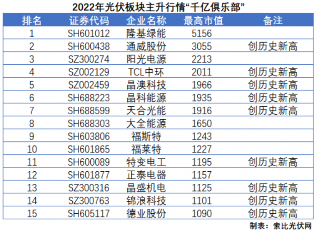令人欣喜的是,主升階段“光伏千億俱樂部”擴(kuò)容至15家,其中隆基綠能行業(yè)龍頭地位依舊穩(wěn)固,最高市值達(dá)到5156億;通威股份、TCL中環(huán)總市值歷史首次突破3000億和2000億大關(guān);陽光電源依然穩(wěn)坐逆變器頭把交椅,最高市值達(dá)到2213億元;晶澳科技、晶科能源、天合光能三大組件龍頭最高市值均超過1900億。