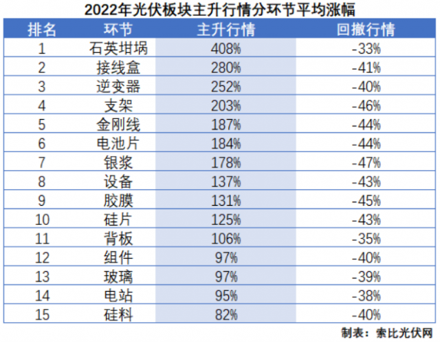 在漲幅居前的環(huán)節(jié)中,石英坩堝受益于高純石英砂緊缺以及市場需求爆發(fā),產(chǎn)品呈現(xiàn)“量價齊升”的局面,尤其是高純石英砂價格,年內(nèi)漲幅超過150%。逆變器受益于歐洲戶用光儲市場的全面爆發(fā),以及相對穩(wěn)定的競爭格局,頭部企業(yè)出貨量大超市場預(yù)期。