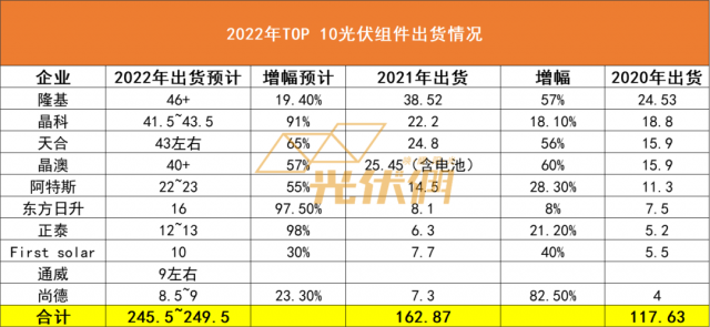 市場(chǎng)規(guī)模刷新紀(jì)錄的同時(shí),龍頭企業(yè)組件出貨規(guī)模也在快速攀升。近日,光伏們通過(guò)企業(yè)內(nèi)部咨詢、第三方統(tǒng)計(jì)機(jī)構(gòu)以及券商公開(kāi)資料統(tǒng)計(jì)了2022年TOP 10組件出貨情況,10家企業(yè)合計(jì)出貨規(guī)模約為250GW,其中,前四家組件企業(yè)的出貨數(shù)據(jù)愈發(fā)膠著,排名爭(zhēng)奪戰(zhàn)一觸即發(fā)。