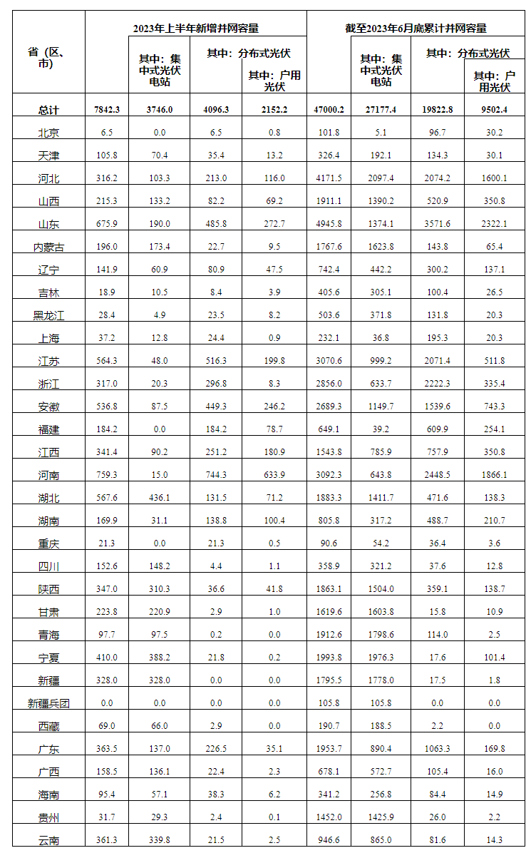國(guó)家能源局7月27日發(fā)布的光伏發(fā)電建設(shè)運(yùn)行情況顯示,2023年上半年新增并網(wǎng)容量7842.3萬(wàn)千瓦,其中集中式光伏電站為3746萬(wàn)千瓦,分布式光伏為4096.3萬(wàn)千瓦。