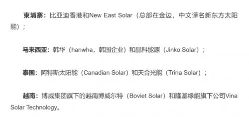 結(jié)果發(fā)現(xiàn)有5家公司試圖規(guī)避關(guān)稅,它們分別是:比亞迪、隆基綠能、阿特斯太陽能、天合光能和新東方太陽能,其業(yè)務(wù)部門都被認(rèn)定違反了反傾銷和反補(bǔ)貼稅法律,必須支付高額關(guān)稅。而主要的組件供應(yīng)商韓華、晶科、博維等沒有違反法律。