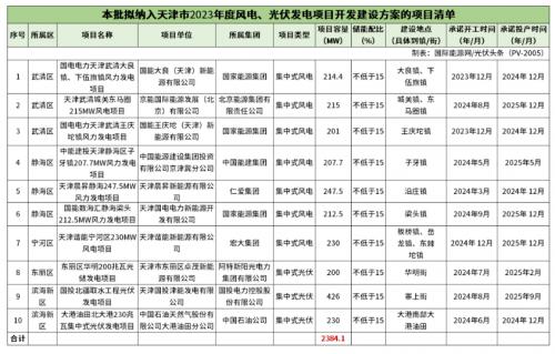 本次納入天津市2023年風電、光伏發(fā)電項目共計10個,規(guī)??傆?384.1MW,其中,風電項目7個,規(guī)??傆?528.1MW;光伏項目3個,規(guī)模總計856MW。