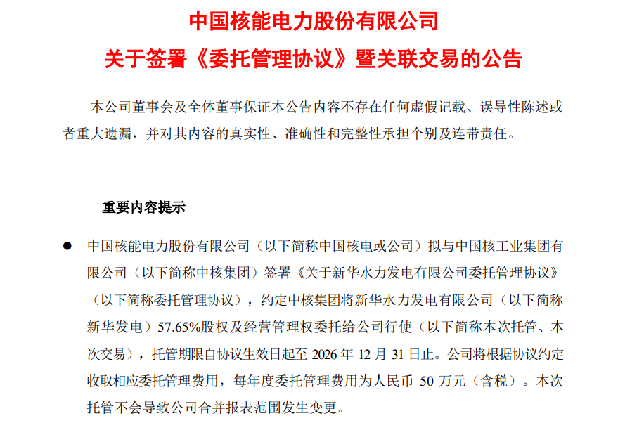 中國(guó)核電將根據(jù)協(xié)議約定收取相應(yīng)委托管理費(fèi)用,每年度委托管理費(fèi)用為人民幣50萬元(含稅)。本次托管不會(huì)導(dǎo)致中國(guó)核電合并報(bào)表范圍發(fā)生變更。至此,中核集團(tuán)所屬的兩大非核清潔能源投資平臺(tái)——中核匯能和新華發(fā)電,正式“合體”。