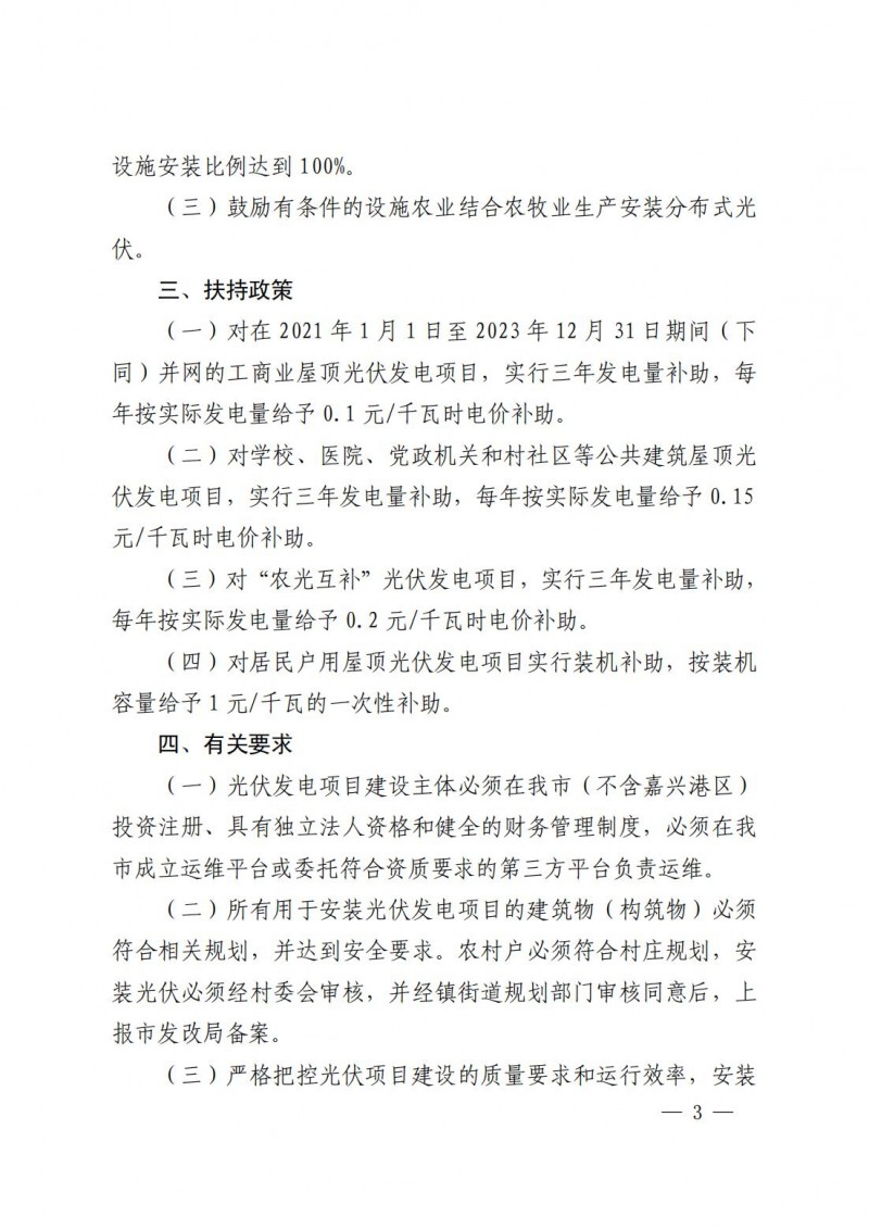 同時(shí)繼續(xù)對(duì)利用農(nóng)村獨(dú)立住宅屋頂或庭院、新農(nóng)村集中連片住房、城鎮(zhèn)高(多)層住宅小區(qū)、公寓、保障性住房、別墅排屋等民居建筑屋頂和農(nóng)村村級(jí)組織集體屋頂、城鎮(zhèn)社區(qū)公共建筑屋頂?shù)募彝ノ蓓敼夥?xiàng)目實(shí)施補(bǔ)貼,市級(jí)財(cái)政對(duì)2021年至2025年期間并網(wǎng)的家庭屋頂光伏項(xiàng)目按0.45元/千瓦時(shí)標(biāo)準(zhǔn)給予補(bǔ)貼,補(bǔ)貼時(shí)限為并網(wǎng)發(fā)電之后第二個(gè)完整抄表月起12個(gè)月。