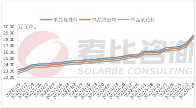回顧2022年上半年,硅料價格整體呈現(xiàn)單邊上漲趨勢,單晶復投料、單晶致密料、單晶菜花料均價漲幅分別為23.14%、23.24%、23.61%。