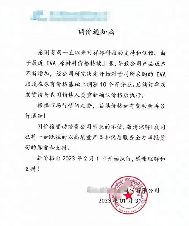感謝貴司一直以來對祥邦科技的支持和信賴。由于最近 EVA 原材料價(jià)格持續(xù)上漲,導(dǎo)致公司產(chǎn)品成本不斷增加,經(jīng)公司研究決定開始對貴司所采購的 EVA膠膜在原有價(jià)格基礎(chǔ)上調(diào)漲 10 個(gè)百分點(diǎn)。后續(xù)訂單及發(fā)貨請與我司銷售人員重新確認(rèn)價(jià)格后執(zhí)行。