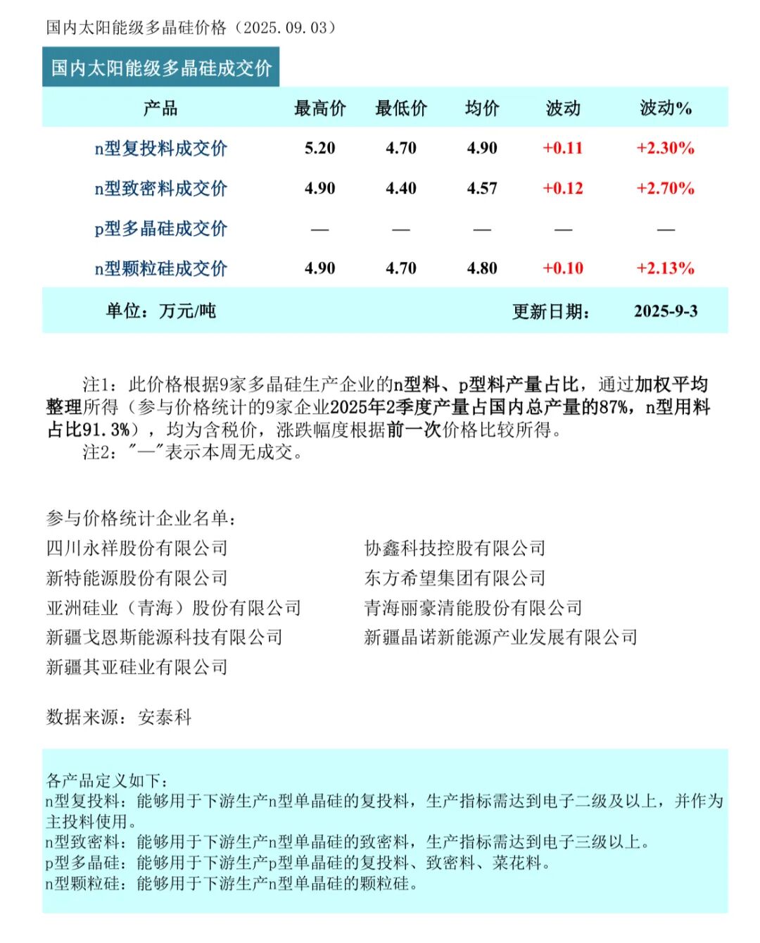 9月3日,中國有色金屬工業(yè)協會硅業(yè)分會發(fā)布本周多晶硅成交價格統(tǒng)計。n型復投料成交均價4.90萬元/噸,周環(huán)比上漲2.30%;n型致密料成交均價4.57萬元/噸,周環(huán)比上漲2.70%;n型顆粒硅成交均價4.80萬元/噸,周環(huán)比上漲2.13%。