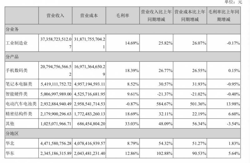 具體到欣旺達旗下各大業(yè)務分類,欣旺達的業(yè)務主要是消費電子類業(yè)務(包括手機數(shù)碼類、筆記本電腦類和智能硬件類)和汽車及動力電池類業(yè)務組成。而目前欣旺達的總體收入主要來源依然是消費電子業(yè)務,2021年實現(xiàn)營業(yè)收入312.16億元,同比增長16%,占比達到83.57%,其中手機數(shù)碼類的毛利率維持在18.39%,近3年變化不大。
