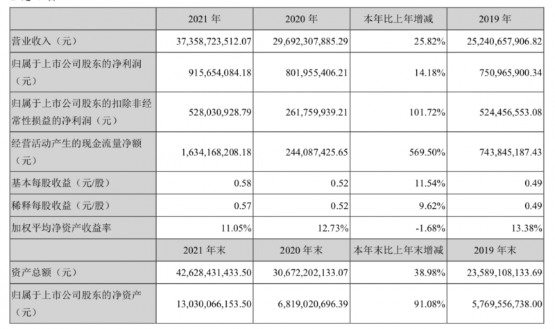 4月12日晚上,欣旺達公布了2021年的年報業(yè)績,整個2021年欣旺達實現(xiàn)了全年營業(yè)收入373.6億元,同比增長25.82%,歸母凈利潤為9.16億元,同比增長14.18%,扣非凈利潤為5.28億元,同比增長101.7%,毛利率為14.69%,基本持平,凈利率降低了0.4個百分點到2.29%。