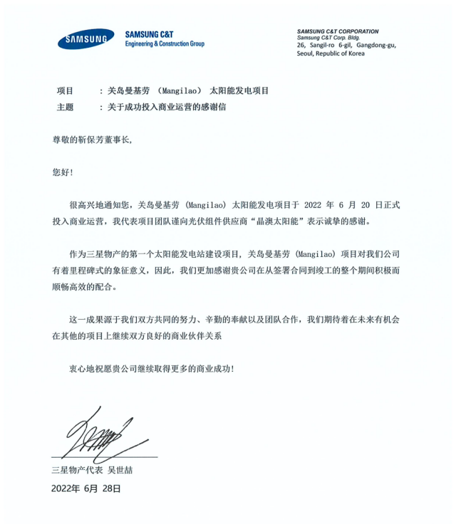為表示對(duì)晶澳在項(xiàng)目建設(shè)過(guò)程中的大力支持以及對(duì)晶澳高品質(zhì)產(chǎn)品的贊賞和感謝,三星物產(chǎn)在項(xiàng)目建成后特寄來(lái)感謝信,以表謝意。三星物產(chǎn)在感謝信中寫(xiě)道:“作為三星物產(chǎn)的第一個(gè)太陽(yáng)能發(fā)電站建設(shè)項(xiàng)目,關(guān)島曼基勞項(xiàng)目對(duì)我們公司有著里程碑式的象征意義,因此,我們更加感謝貴公司在從簽署合同到竣工的整個(gè)期間積極而順暢高效的配合?!?/p>