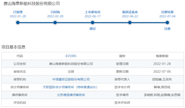 7月6日,中國(guó)證監(jiān)會(huì)同意海泰新能向不特定合格投資者公開(kāi)發(fā)行股票并在北京證券交易所上市的注冊(cè)申請(qǐng),公司將于近期正式登陸北交所。