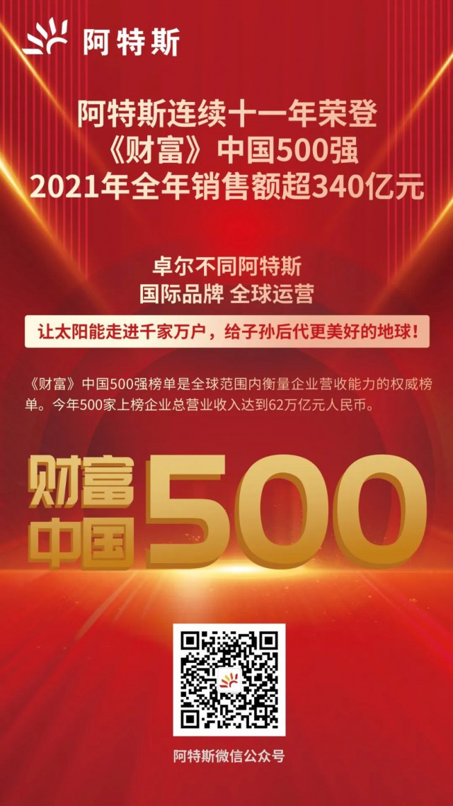 7月12日,財(cái)富中文網(wǎng)發(fā)布2022年《財(cái)富》中國(guó)500強(qiáng)排行榜,阿特斯陽光電力集團(tuán)憑借2021年340億元營(yíng)收再次榮登榜單。這是阿特斯集團(tuán)連續(xù)第十一年上榜,充分彰顯了公司高質(zhì)量可持續(xù)發(fā)展的澎湃動(dòng)力。