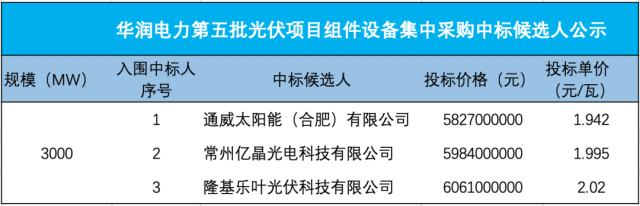 8月17日,華潤電力第五批光伏項目光伏組件設備集中采購中標候選人公示,通威太陽能、億晶光電、隆基入3家企業(yè)入圍。