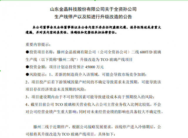 金晶科技9月12日公告,2012年9月8日滕州金晶玻璃有限公司(公司全資孫公司)二線600T/D 玻璃生產(chǎn)線(“滕州二線”)點火運行,截至目前已經(jīng)達到設(shè)計窯齡,目前窯爐侵蝕狀況比較嚴重,窯爐運行安全存在一定隱患,鑒于此,公司于近期對其停產(chǎn)。
