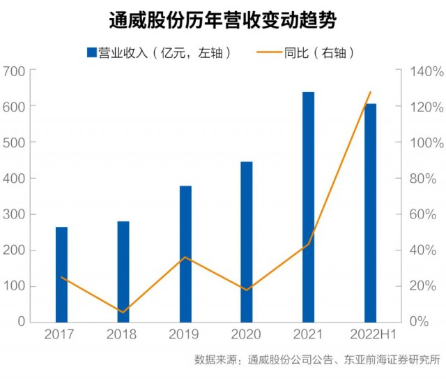 截至2022年三季度末,通威股份為全球第一大多晶硅廠商,全球市場份額近30%。另據(jù)PV Infolink數(shù)據(jù),2022年上半年,電池片出貨排名前五分別為通威股份、愛旭股份、潤陽股份、中潤光能、捷泰科技。通威股份為第一大電池片廠商。