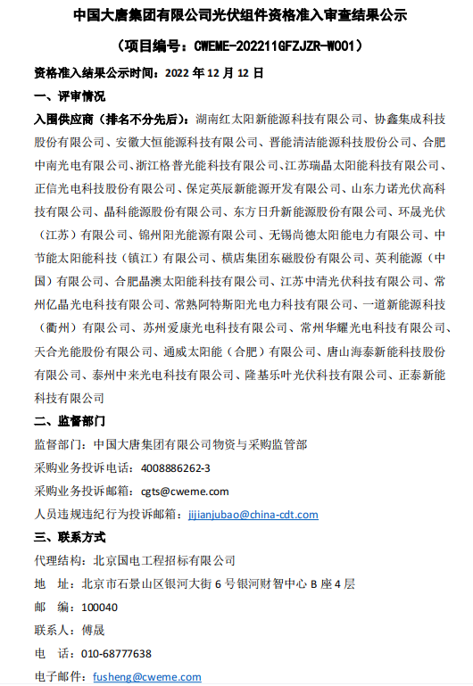12月12日,中國大唐集團(tuán)對光伏組件資格準(zhǔn)入審查結(jié)果進(jìn)行公示,共31家光伏組件企業(yè)入圍。